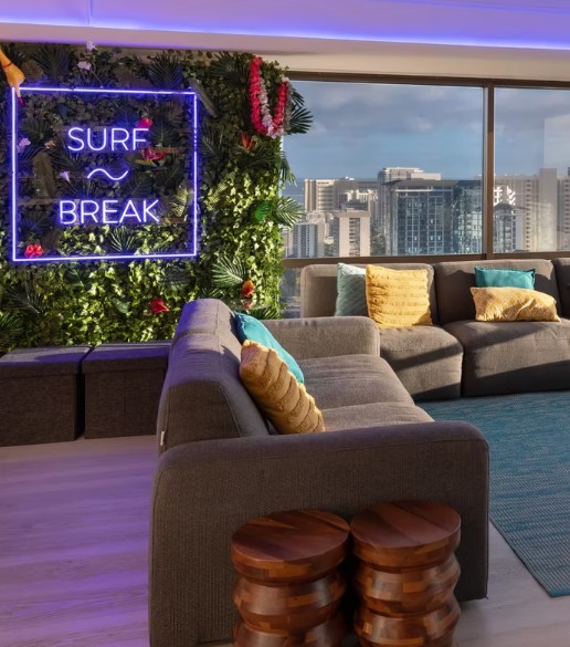 Surfbreak is een co‑living en coworking netwerk gericht op reizigers die remote werken. Op dit moment bezit de organisatie een penthouse (op de 40e(!) verdieping van een hoge toren, 10 minuten van Waikiki beach) op Hawaii en een villa in Puerto Escondido Mexico. Veel mensen verblijven hier voor een iets langere periode, waardoor het echt een beetje voelt alsof je in een studentenhuis woont, maar wél luxer en met een hoger prijskaartje. Je deelt de gemeenschappelijke ruimte met flink wat roomies, dat heeft zo zijn voor- en nadelen.