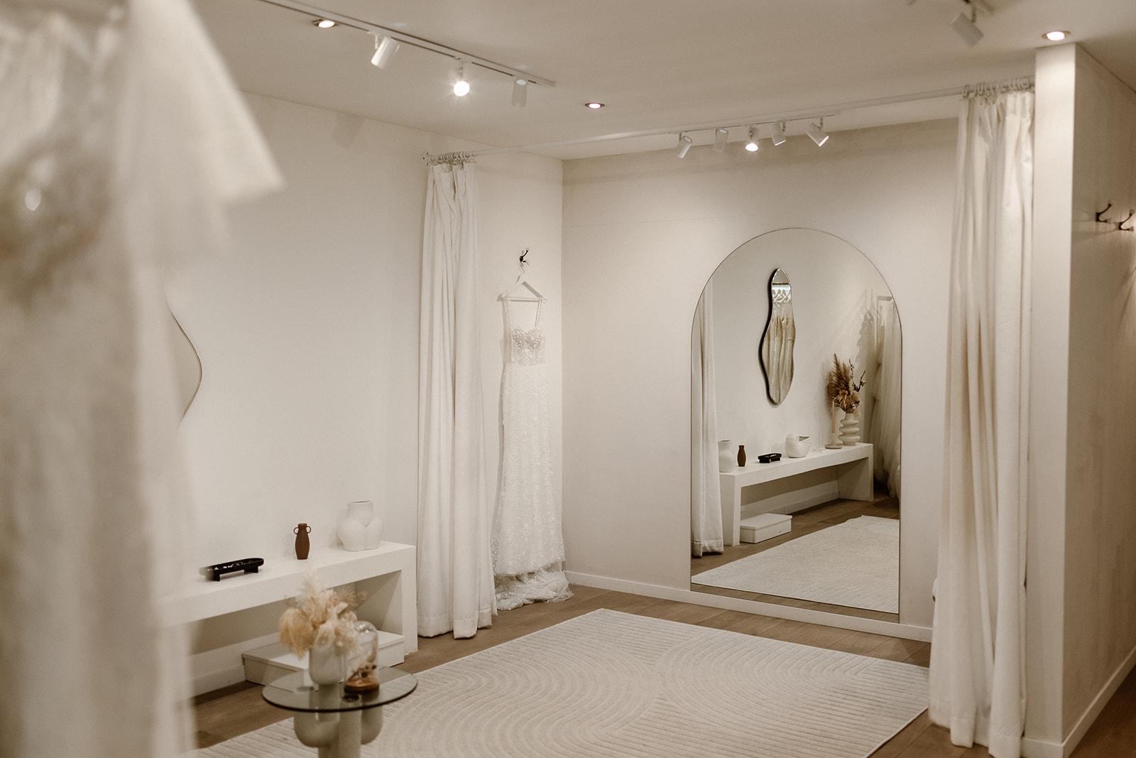Dan de jurk. We stapten binnen bij Modern Romance in Hilversum, een walhalla voor eigentijdse en super stijlvolle jurken. Kiezen viel niet mee, maar Kelly besloot dit keer voor twee moderne maar elegante en romantische jurken te gaan. Spoiler alert: voor haar grote dag gaat ze toch een andere stijl kiezen, maar die houden we nog even geheim. Het geheel werd prachtig afgestyled met de juwelen van goudsmid en designer Charlotte de Koomen. Een chunky parelketting voor een statement, een subtiele oorbel en kleurrijke edelstenen verwerkt in snoepjes van ringen. Dan de finishing touch: een flower bomb aan kleur voor het bruidsboeket door Studio Fluitenkruid.