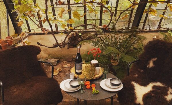 Tussen die huizen vind je een klein pad, groen van de planten. Dat is de entree en meteen daar begint de rust: vogels, de geur van groen en verder helemaal niks. Ja, een beeldschone B&B dus, ingericht met een mix van Scandinavisch en vintage design tegen de historische achtergrond van de druivenkas. De gastenkamers (er zijn er twee nu, maar er zijn plannen voor meer) zijn met heel veel liefde en smaak ingericht. Hallo daar: Scandinavisch en vintage again.