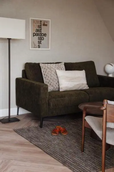 De inrichting verwijst naar het werk van Friso Kramer, de Nederlandse meubelontwerper. Zijn vader, Piet Kramer, behoorde tot de belangrijkste architecten van de Amsterdamse School. Weet je dat ook weer. Die erfenis vertaalde zich in ogenschijnlijk eenvoudige kamers die zijn ingericht in midcentury modern-stijl: warme tinten, organische vormen en tijdloze meubels die comfortabel zijn zonder opzichtig te worden.