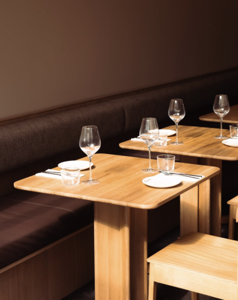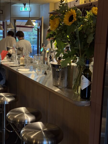 Binnen is het ruim en licht, dankzij de grote glazen ramen en zelfs glas in het dak, waardoor er van bovenaf ook een mooie lichtinval is (we love goed licht). De inrichting is chic maar heel toegankelijk: frisse bloemen, warm kaarslicht, een gezellige bar (waar je trouwens ook aan kunt eten) en een knusse huiselijke sfeer wat je bij binnenkomst al gelijk voelt. Overigens staan de mannen die de brasserie hebben opgericht staan zelf in de keuken en bediening, en komen gezellig een praatje maken.