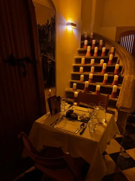 Het is net een sprookje wanneer je bij aankomst langs de grote Robinia (wensboom) loopt, met zijn kronkelende takken vol met scherpe doorns. Daarna wandel je door een tijdmachine terwijl je de ridderzaal en voorraadkamers verkent. Aan tafel! In het sfeervolle koetshuis, naast het kasteel ligt, wacht ook hier weer een heerlijk vijfgangendiner op je.
