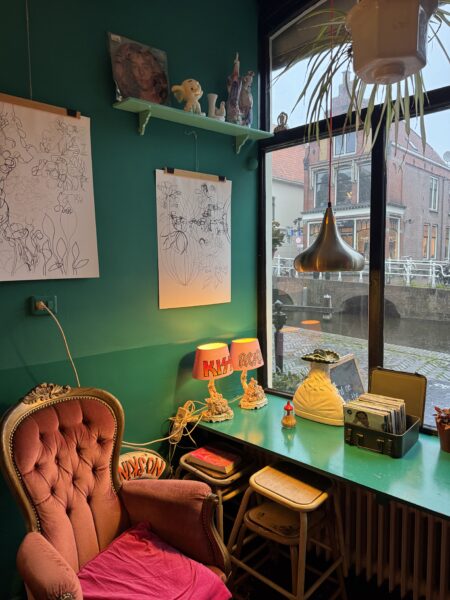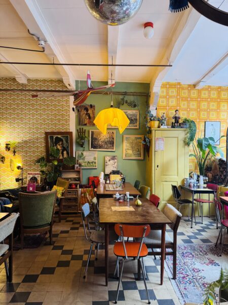 Maar genoeg over de locatie, hier draait het om de sfeer. En de sfeer is warm, levendig en vooral heel creatief. Het handschrift van eigenaresse Sabine is overal terug te zien. Een vrolijke retro-mengelmoes vol kunst, design en kaarsen (die zijn overigens ook te koop). Perfect voor een koffie of lunchdate. Oh en de matcha met mango en versgebakken appeltaart…die móét je proeven.