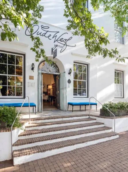 In het hart van het te leuke Stellenbosch, een van de oudste steden van heel Zuid-Afrika, staat het sfeervolle Oude Werf Hotel. Het hotel bestaat al drie eeuwen, waarmee het het oudste hotel van Zuid-Afrika is, al zie je dat er niet aan af: het boetiekhotel is zowel authentiek sfeervol als modern en van nu. De kamers rondom de ruime patio (met zwembad uiteraard) zijn voor een groot deel van glas; mooi. Niet gevreesd: er zijn gordijnen. En hoewel het hotel supercentraal in het leuke Stellenbosch staat (sommige kamers kijken uit op Church Street), is een avondeten in het hotel-restaurant al twee eeuwen een zogenoemde must.