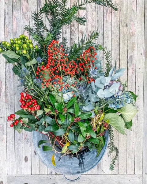 Groen en decoratie: takken, bessen, dennenappels, bloemen.