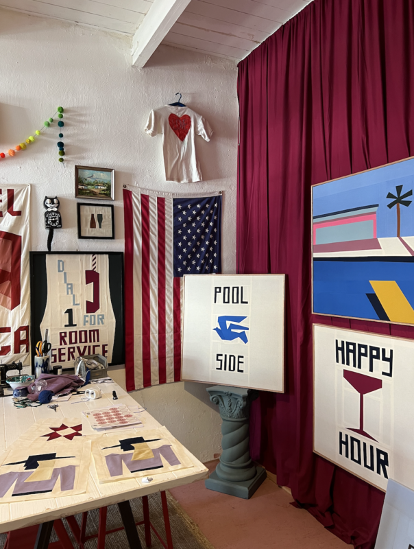 Tijd om Motel Bodega meer aandacht te geven. Megan ontwerpt vanuit haar Amsterdamse studio unieke quilt-artworks op de naaimachine. De stijl van haar kunstwerken? Denk ‘vrolijke nostalgie’ met een flinke dosis Amerika, geïnspireerd door de vele roadtrips door de VS in 70’s style. Fantastisch.