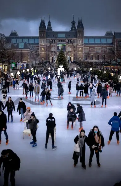 Ook de iconische Christmas Winter Village is weer te vinden op het museumplein dit jaar. Vlak voor het Rijksmuseum staan talloze kraampjes om te shoppen, eten en vooral veel drinken. De Christmas Winter Village is dit jaar geopend van 4 december t/m 28 december en is absoluut (!) de moeite waard om langs te gaan. Niet alleen is het museumplein heel goed bereikbaar, deze kerstmarkt (met de teruggekeerde ijsbaan) is onmisbaar tijdens de kerst periode in Amsterdam. Zoals we al kort zeiden, ook de ijsbaan is weer terug, en dat is natuurlijk groot nieuws, want wie wil nou niet met uitzicht op het Rijksmuseum, warme choco (met rum) in de hand, tussen alle lichtjes schaatsen in hartje Amsterdam?