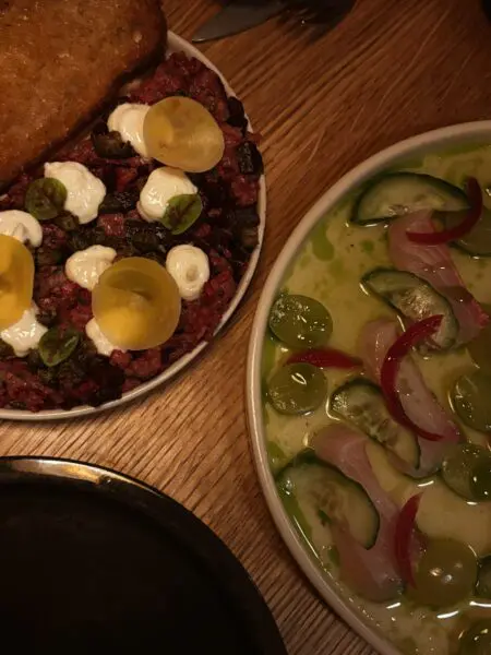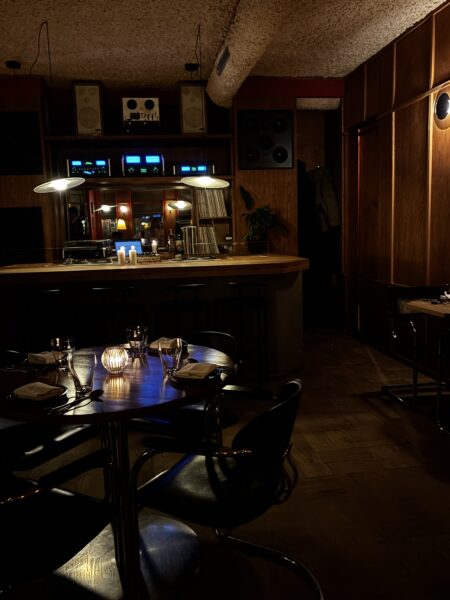 En dan de menukaart, precies zoals we hopen bij een plek waar smaak en sound hand in hand gaan. Geen ellenlange opsomming, maar een zorgvuldig gekozen selectie gerechten. Denk aan seizoensgerechten met een wereldse twist. De gerechten zijn gemaakt om te delen (of niet, nobody’s judging), en alles komt in een tempo dat ons uitnodigt om te blijven zitten, luisteren, nippen, praten en weer een hap te nemen. De drankenkaart sluit er moeiteloos op aan: natuurlijke wijnen die precies goed funky zijn, cocktails die chic maar speels blijven, en genoeg alcoholvrije opties voor wie met een helder hoofd wil genieten.
