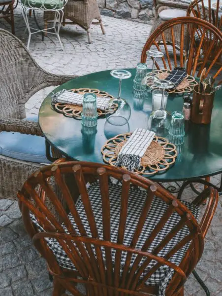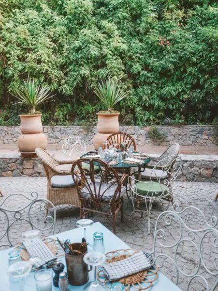 De grote tuin is een groene oase met sfeerverlichting, terrasjes en een open bar met rieten lampionnen. Hier vind je ook de originele pétanquebaan, waar de boules klaarliggen voor een potje na de lunch.