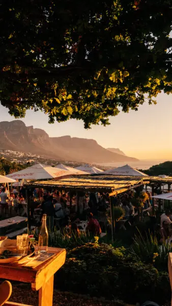 Het Roundhouse Restaurant in de bergen van Camps Bay is een Kaapstadklassieker. Hoewel de plek, in tegenstelling tot Babylonstoren, nogal wat verschillende eigenaren heeft gekend: het ronde huis was ooit een hotel, een danssalon, het jachthuis van een oude Lord en geregeld een restaurant. Tegenwoordig heet het terras, het groen rond het ronde restaurant dat verschillende hoogtes beslaat, The Lawns, met dank aan het grote grasveld voor het huis. De idyllische plek ligt in het Tafelbergpark en dateert uit de achttiende eeuw, toen het dienst deed als wachthuis. Het is namelijk een perfecte uitkijkplek met eindeloze uitzichten over de oceaan (hello sunset). Met name vanaf het grote terras (de zitjes die het hoogst zijn, onder de eikenbomen, vinden we het leukst) voor de deur, dat verschillende hoogteniveaus kent en dat eindigt in de bossen. De plek is en blijft geweldig: in de zomermaanden (onze wintermaanden) zijn het de picknicks en de braais waar je aan wilt schuiven.