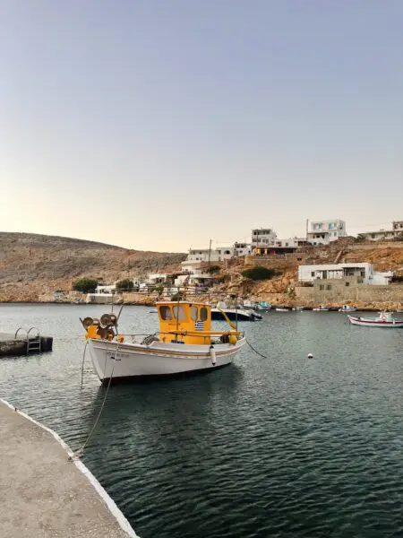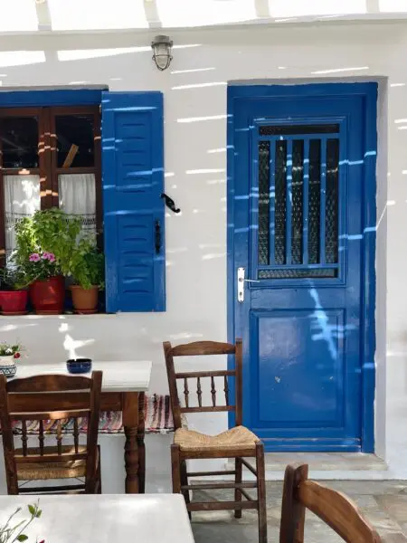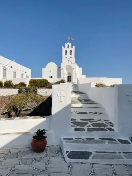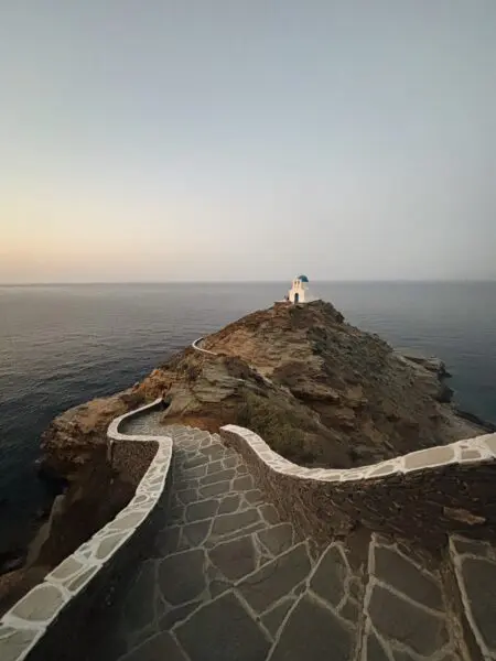 Niet echt een strand, maar wél aan het water: de Church of the Seven Martyrs. Echt zo’n plek die sowieso op je Instagram belandt. Een kleine, witte kapel met blauwe koepel, op een rots midden in zee, net buiten Kastro. Het ziet eruit alsof iemand een filmset is vergeten op te ruimen – zó mooi. De trap ernaartoe kronkelt langs de rotsen, met overal dat eindeloze blauw. Absoluut een must visit voor je het eiland verlaat.