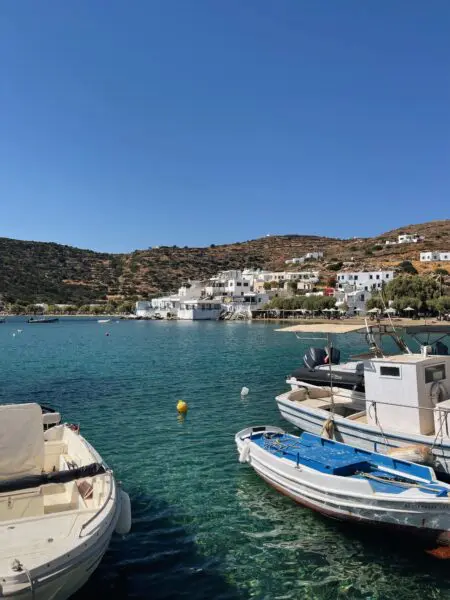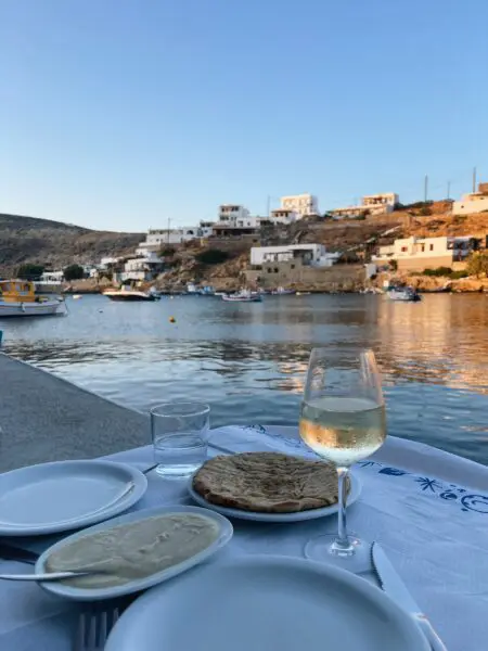 Op zo’n tien minuten rijden van de hoofdstad Apollonia ligt Faros Beach, het strand van het charmante vissersdorp Faros. Parkeren? Gratis én pal aan het strand, dat is op het hele eiland zo (is dat op zich al niet vakantie?). Daarna is het simpel: koffie en iets zoets bij Betty’s Bakery, gevolgd door een lunch bij Pelicanos. Vlak aan het strand, met zicht op zee. Faros is zo’n plek waar je zonder plan belandt en toch de hele dag blijft hangen.