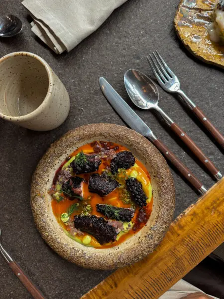 Binnen is alles doordacht: hout, steen, kunst aan de muren en een warme, bijna theatrale verlichting die het grillvuur extra laat opvallen. De open keuken draait om de parrilla: van dry-aged steaks tot een complete mixed grill die zelfs voor twee royale eters een uitdaging is. Alles, van het brood tot de sauzen en het ijs, wordt in huis gemaakt. De cocktailkaart speelt een hoofdrol, met creatieve combinaties waarin ook het yonque-distillaat opduikt.