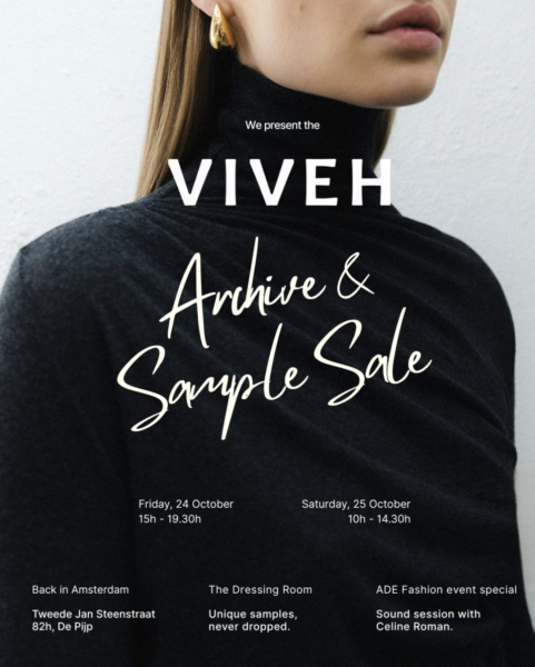 Shop till you drop, tijdens het ADE weekend ( 24 & 25 oktober) kun je bij VIVEH de mooiste items scoren bij hun Archive & Sample Sale in De Pijp. Vrijdag van 15:00 tot 19:00 en zaterdag van 10:00 tot 14:30 scoor je unieke samples die nog nooit eerder zijn gedropt. En omdat het ADE is, luister je tijdens shoppen naar sound sessions van onder andere Celine Roman. Helemaal ADE proof dus.